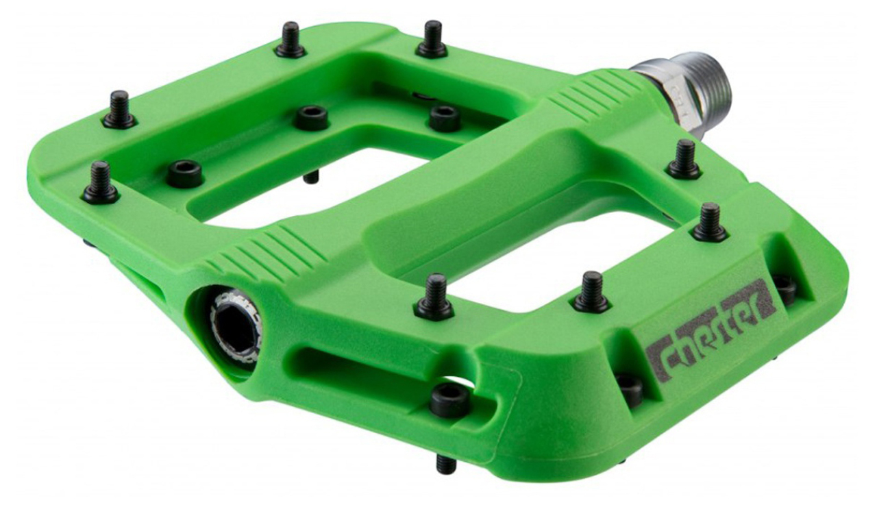 Педали Race Face Chester - профессиональный и не дорогой элемент для активного, экстремального, агрессивного и жесткого катания в MTB дисциплинах. Корпус педалей выполнен из нейлона, армированного стекловолокном. Собраны с использованием промышленного подшипника и втулки скольжения, имеют стальную Cro-Mo ось серии 4140 с резьбой 9/16". Конструкция полностью обслуживаемая. 8 сменных шипов педали позволяют достигать отличного контакта со специализированной MTB обувью, а оптимальная ширина и длина платформы удобна при постоянной стойке на велосипеде. Среди своих одноклассников, обладает сравнительно низким весом при учете достаточно массивной конструкции. Габариты 110х101 мм. Вес педалей составляет 360 грамм в паре. Педали не комплектуются светоотражателями..