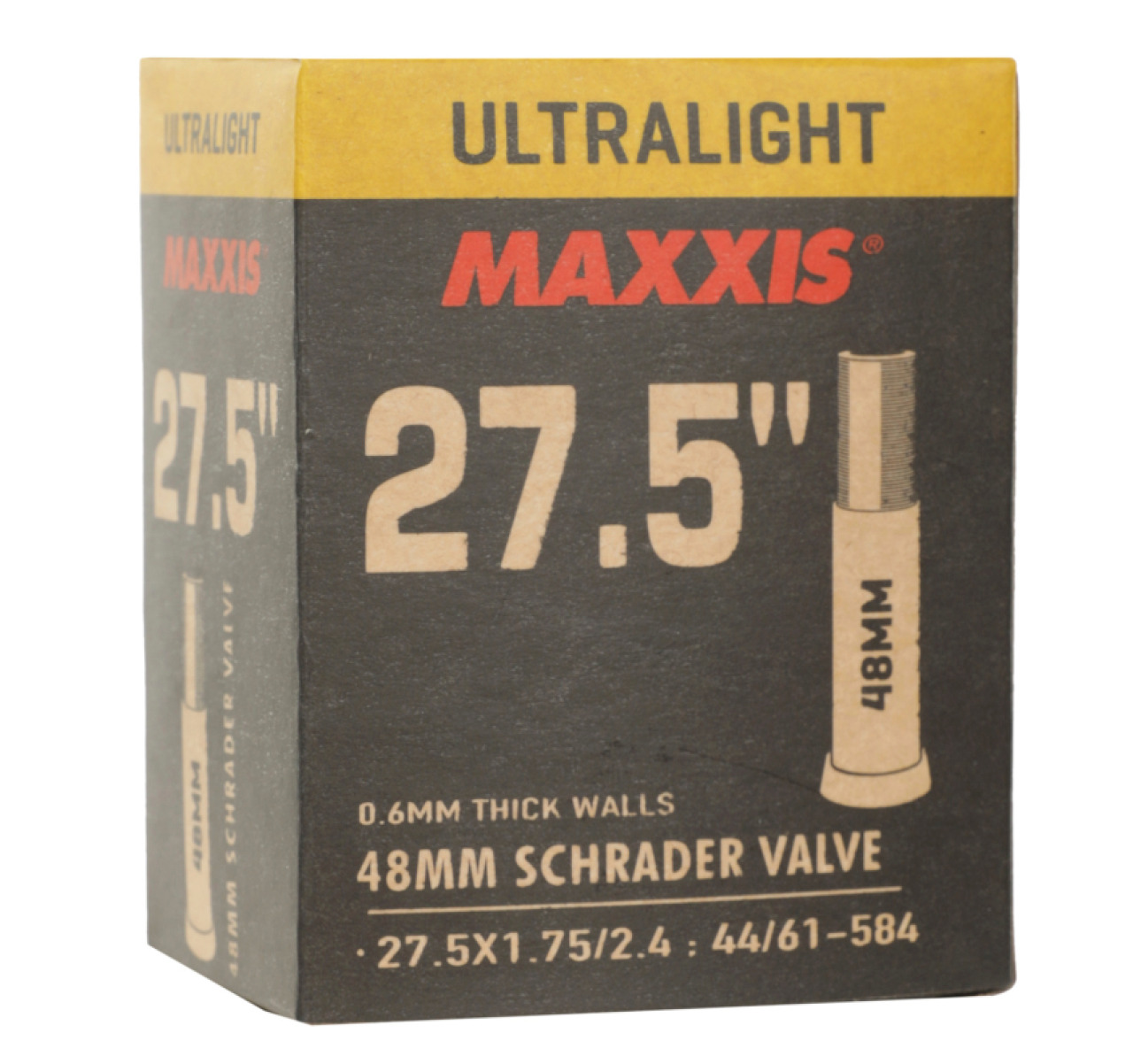 Камера Maxxis Ultralight 27.5x1.75/2.40, A/V, 48 мм. Ultralight- прочная и лёгкая бутилкаучуковая камера для MTB велосипедов от именитого производителя Maxxis. Обладает размером 27,5" и подходит для ширины покрышек от 1.75" до 2.40". Ниппель A/V, рассчитан для установки с ободами под автомобильный ниппель. Ниппель длинной 48 мм, хорошо удерживает давление, резиновый состав имеет толщину 1.2 мм, сверх устойчива к проколам и легко поддается заклейке.